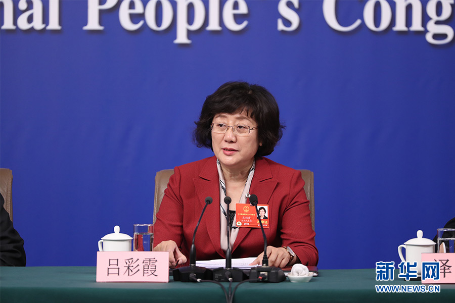 3月12日,十三屆全國人大一次會議新聞中心在梅地亞中心多功能廳舉行記者會,邀請十二屆全國人大內司委副主任委員王勝明、財經委副主任委員烏日圖、教科文衛委副主任委員吳恒、環資委委員呂彩霞,全國人大常委會法工委副主任王超英、副主任許安標就“人大立法工作”相關問題回答中外記者提問。圖為環資委委員呂彩霞回答記者提問。新華網/中國政府網 翟子赫 攝