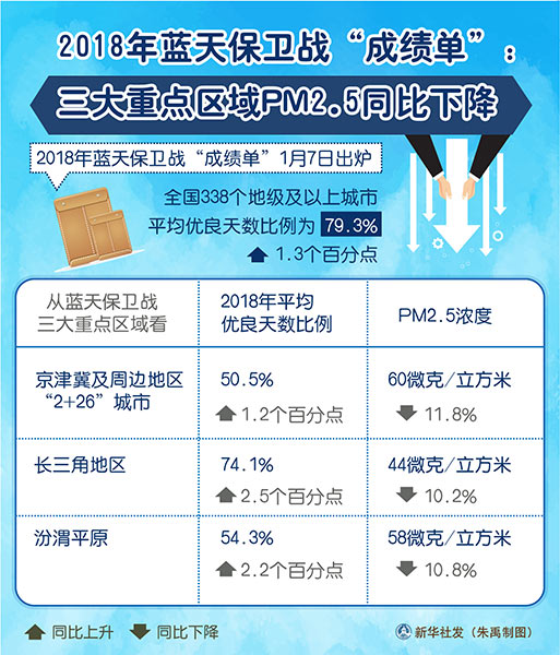 圖表:2018年藍(lán)天保衛(wèi)戰(zhàn)“成績單”:三大重點(diǎn)區(qū)域PM2.5同比下降 新華社發(fā) 朱禹 制圖