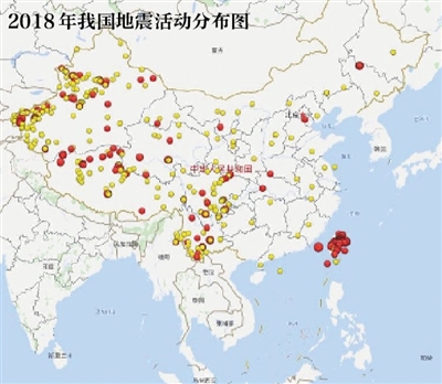 圖中黃色圓點表示3.0級以上地震,紅色圓點表示4.0級以上地震。圓點越大,震級越強。 中國地震局 供圖