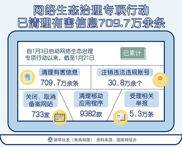 新華社北京1月23日電(記者史競男、白瀛)記者23日從國家網(wǎng)信辦獲悉,自1月3日啟動網(wǎng)絡(luò)生態(tài)治理專項(xiàng)行動以來,截至1月21日,已累計清理有害信息709.7萬余條,注銷違法違規(guī)賬號30.8萬余個,關(guān)閉、取消備案網(wǎng)站733家,清理移動應(yīng)用程序9382款,受理相關(guān)舉報5.3萬條。