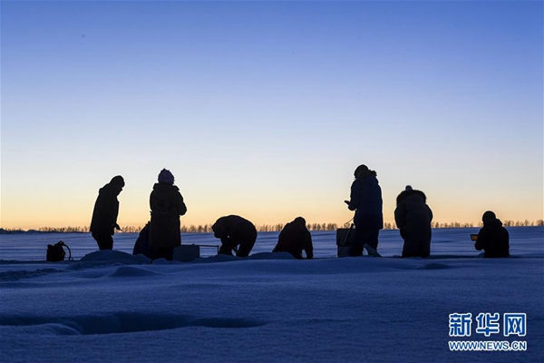 在新疆昭蘇縣喀夏加爾鎮(zhèn)薩爾烏孜克村的積雪調(diào)查區(qū),隊員們在觀測采集積雪特征數(shù)據(jù)(1月18日攝)。 新華社記者 胡虎虎 攝