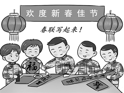 無論鄉村還是城市,春節家家戶戶都要張燈結彩。放鞭炮、貼春聯、逛廟會,其樂融融。能文能武的戰士們,此時也會提筆蘸墨,書寫、張貼春聯和“?!弊?,把天南海北的座座軍營裝點出濃濃年味。