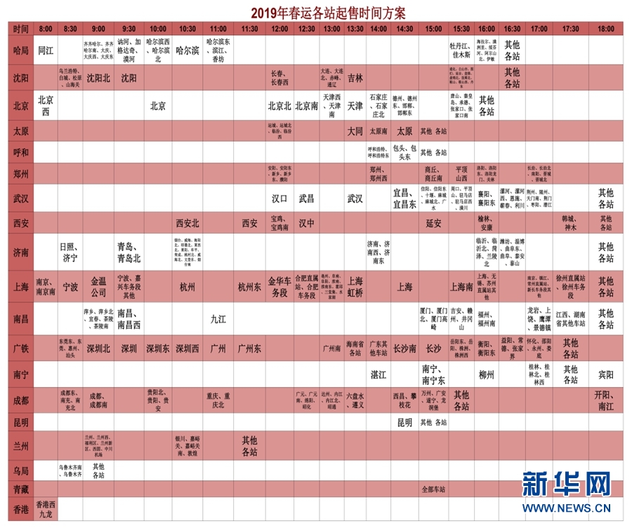 圖為2019年春運(yùn)各站起售時(shí)間分配方案。(12306供圖)