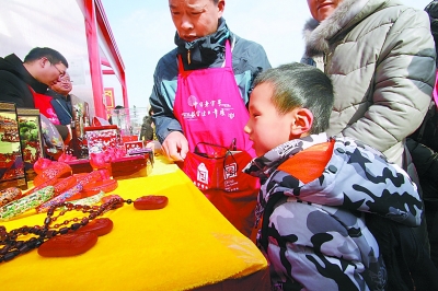 享受了一把精神“大餐”過后,如果也能獲得一些物質上的收獲,那就再完美不過了。在慈寧宮花園、慈寧門外廣場,“中華老字號故宮過大年”熱鬧非凡,來自山東、北京、天津、山西等10個省市以及5家非物質文化遺產傳承人,共計150家單位參加此次活動。