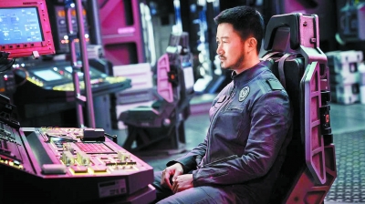 《流浪地球》劇照,吳京飾演航天員劉培強,屈楚蕭飾演其子劉啟。