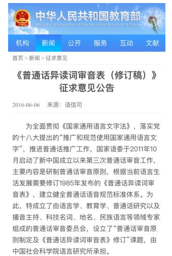 1985年,國家發布《普通話異讀詞審音表》,對一些異讀詞進行了修訂。2016發布的《<普通話異讀詞審音表(修訂稿)>征求意見稿》又對一些讀音進行了新的修訂,并發布在教育部網站上征求意見。