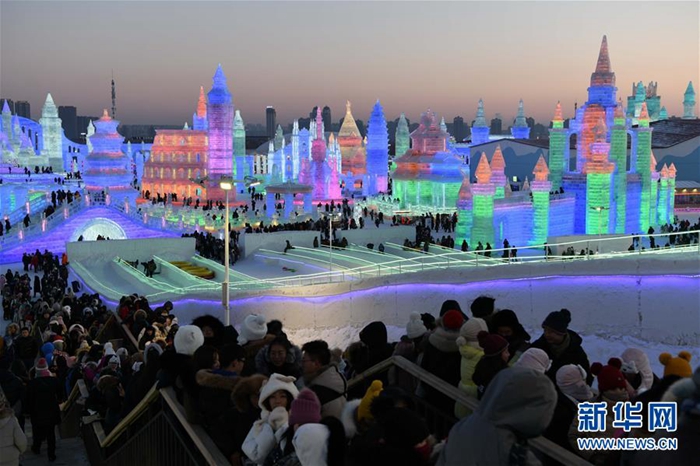 游客在哈爾濱冰雪大世界園區排隊體驗冰雪娛樂項目(1月5日攝)。新華社記者 王建威 攝