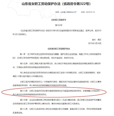 1月31日,山東省人民政府官網(wǎng)全文發(fā)布了該《辦法》。文中就女職工勞動(dòng)保護(hù)范圍、責(zé)任主體、細(xì)化勞動(dòng)保護(hù)措施、強(qiáng)化防止性騷擾和衛(wèi)生保健措施、損害女職工權(quán)益的權(quán)利救濟(jì)途徑等五個(gè)方面,作出規(guī)定。