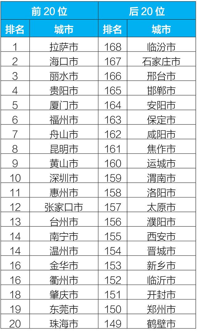 2019年1-2月,168個重點城市中臨汾、石家莊、邢臺市等20個城市空氣質量相對較差(從第168名到第149名);拉薩、海口、麗水市等20個城市空氣質量相對較好。?