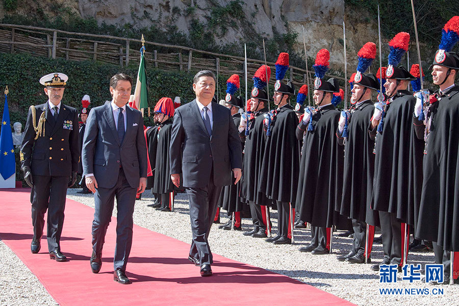習(xí)近平抵達(dá)時(shí),孔特總理在停車處迎接。軍樂團(tuán)奏中意兩國(guó)國(guó)歌。兩國(guó)領(lǐng)導(dǎo)人一同檢閱儀仗隊(duì)。