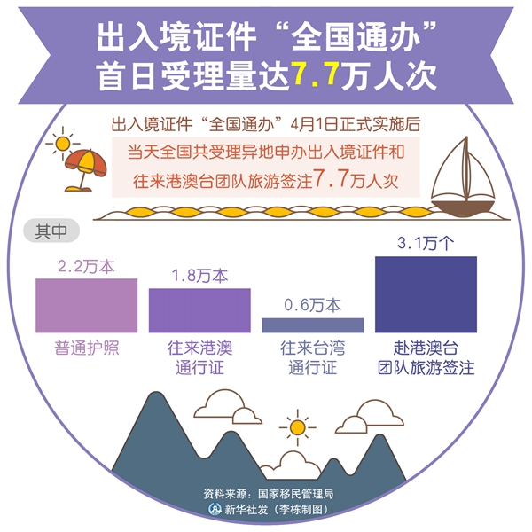 新華社北京4月2日電 記者2日從國家移民管理局獲悉,出入境證件“全國通辦”1日正式實施后,當(dāng)天全國共受理異地申辦出入境證件和往來港澳臺團隊旅游簽注7.7萬人次,其中普通護照2.2萬本、往來港澳通行證1.8萬本、往來臺灣通行證0.6萬本、赴港澳臺團隊旅游簽注3.1萬個。