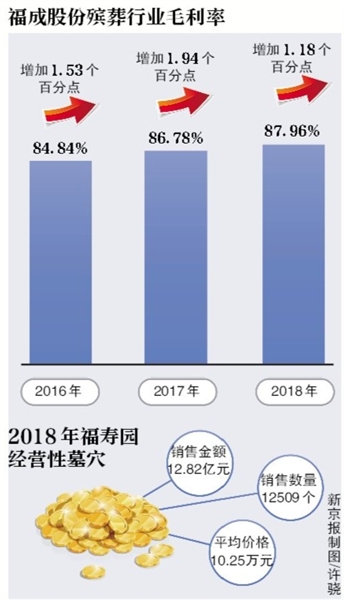 今年3月30日,福成股份發布2018年報顯示,公司殯葬服務業實現營業收入2.60億元,與上年同期相比增長14.70%。殯葬業收入增長主要是銷售價格同比增長所導致,而隨著殯葬業營業收入增加,成本也小幅增長了4.54%。