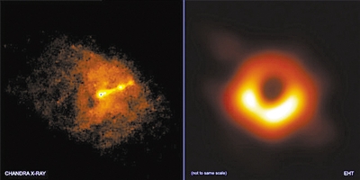 左圖 錢德拉X射線望遠鏡與事件視界望遠鏡同時拍攝的照片,顯示了M87星系中心黑洞的“相對論性噴流”。右圖 事件視界望遠鏡拍攝的M87星系中心黑洞圖像。圖片來源:美國趣味科學網站