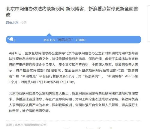 新浪網負責人表示,將嚴格落實網信部門管理要求,在全面深入整改期間對問題突出的PC端“新浪博客”和“新浪看點”平臺自行暫停更新1個月,對“新浪新聞”、“新浪博客”APP下架1個月,時間從4月17日15時至5月17日15時。
