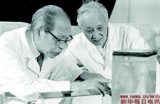 夏穗生教授(右)和裘法祖教授在一起研究肝移植病例。(1986年6月30日發(fā)) 新華社記者于澄建攝