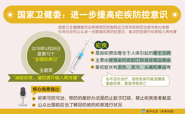 新華社北京4月25日電(記者田曉航)今年4月26日是第12個“全國瘧疾日”,主題是“消除瘧疾,謹(jǐn)防境外輸入再傳播”。國家衛(wèi)生健康委員會疾病預(yù)防控制局近日發(fā)布瘧疾防治宣傳核心信息,引導(dǎo)社會和公眾進(jìn)一步提高瘧疾防控意識,重點防控境外瘧疾輸入再傳播。