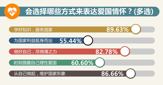 大學生表達愛國的方式更加務實,94.03%的受訪者認為“理性愛國是最好的方式”。超過80%的大學生認為愛國要先從自己做起,“學好知識、服務國家”“做好自己,為社會盡綿薄之力”等成為很多大學生的首選。陜西師范大學學生強德平說,愛國有三點,第一是銘記歷史,第二是展望未來,第三是把握當下。中國人民大學學生張嘯寒說,走到人民生產實踐的第一線,是關心國家和社會的最好方式。