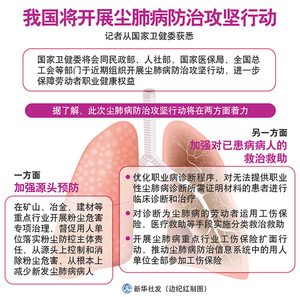 “整個攻堅行動包括粉塵危害專項治理、塵肺病病人救治救助、職業健康監督執法、用人單位主體責任落實以及防治能力提升等五項行動。”李斌說。