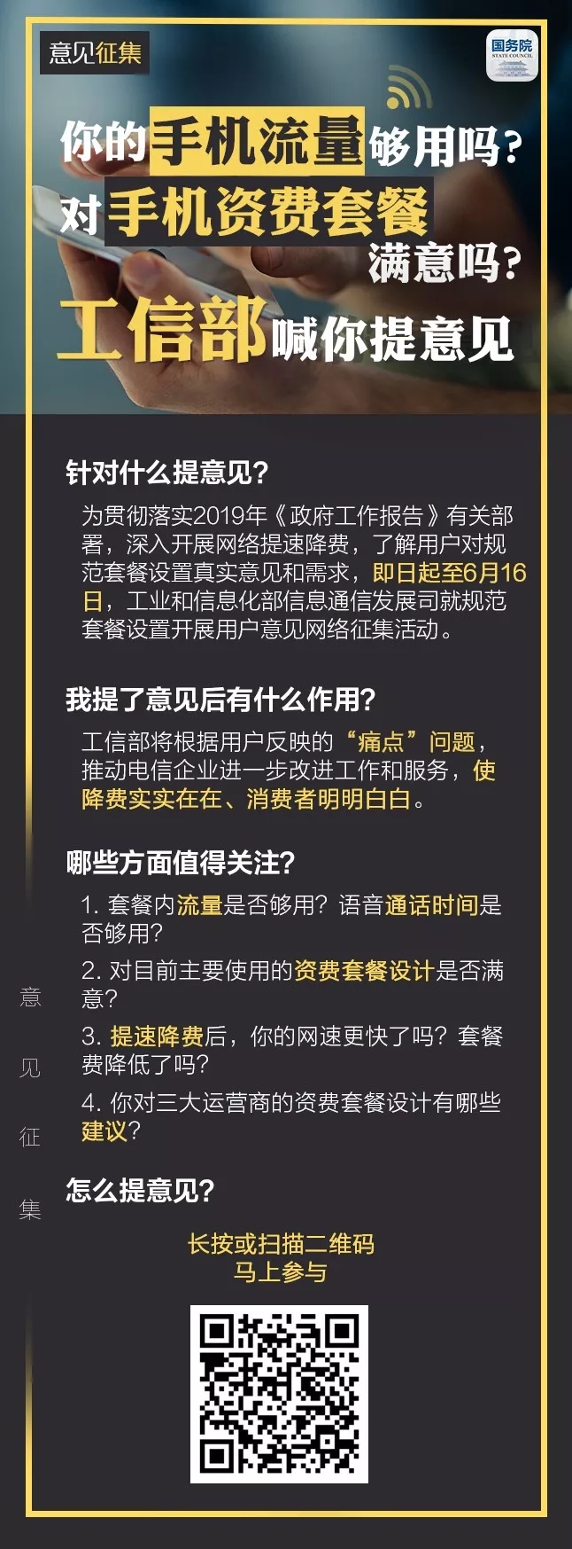 你的手機(jī)流量夠用嗎?對(duì)手機(jī)資費(fèi)套餐滿意嗎?工信部喊你提意見
