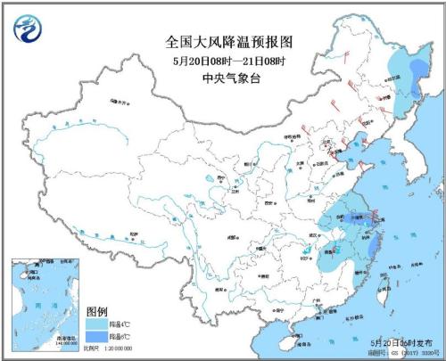 全國大風(fēng)降溫預(yù)報圖(5月20日08時-21日08時)