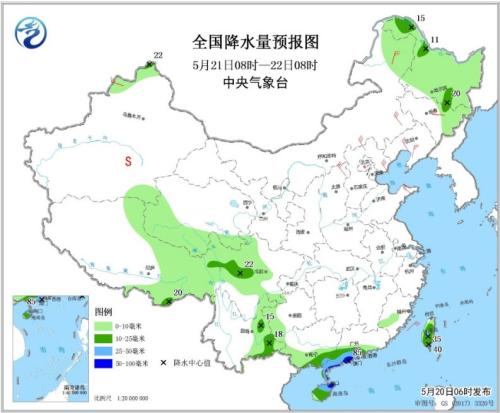 全國降水量預(yù)報圖(5月21日08時-22日08時)