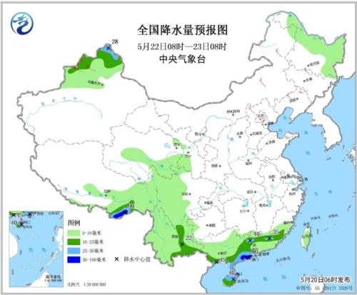5月22日08時至23日08時,新疆北部、西藏東南部、云南東部和南部、華南東部和南部等地的部分地區(qū)有中到大雨,其中,西藏東南部、廣東西南部等地的部分地區(qū)有暴雨(50~90毫米)。新疆北部、內(nèi)蒙古中東部、東北大部等地的部分地區(qū)有4~6級風(fēng),其中,新疆山口地區(qū)風(fēng)力可達(dá)7~8級。