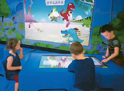 陸浩川團(tuán)隊(duì)的人機(jī)交互產(chǎn)品如今已銷往全球20多個(gè)國(guó)家。圖為兒童正在交互屏幕前玩得不亦樂乎。(受訪者供圖)