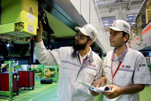 中車株機公司巴基斯坦籍員工可汗和阿哈在做機車工藝檢測。(中車株機公司李歆彧供圖)