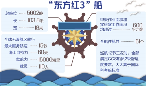 “東方紅3”船是一艘5000噸級新型深遠海綜合科學考察船,以培養(yǎng)深海大洋創(chuàng)新型人才為首要任務,融合科學研究、科學考察、高新技術(shù)研發(fā)應用為一體。該船總長103.8米、寬18米,海上自持力長達60天,可連續(xù)航行1.5萬海里;載員110人,甲板作業(yè)面積和實驗室工作面積均超過600平方米。該船是目前世界上最安靜,定員最多,經(jīng)濟性、振動噪聲、電磁兼容等指標要求最高,作業(yè)甲板和實驗室面積利用率最大、綜合科考功能最完備的新一代海洋綜合科考船。