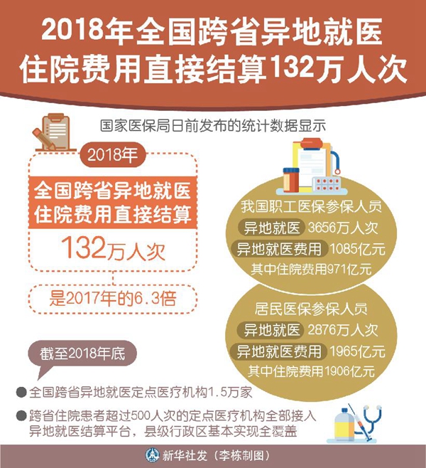截至2018年底,全國跨省異地就醫(yī)定點醫(yī)療機構(gòu)1.5萬家,跨省住院患者超過500人次的定點醫(yī)療機構(gòu)全部接入異地就醫(yī)結(jié)算平臺,縣級行政區(qū)基本實現(xiàn)全覆蓋。