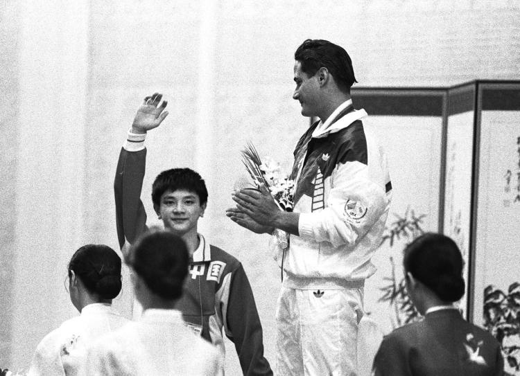 1988年9月27日,獲第24屆奧運會男子跳臺跳水銀牌的中國選手熊倪在領獎臺上向觀眾致意。新華社記者 韓居策 攝