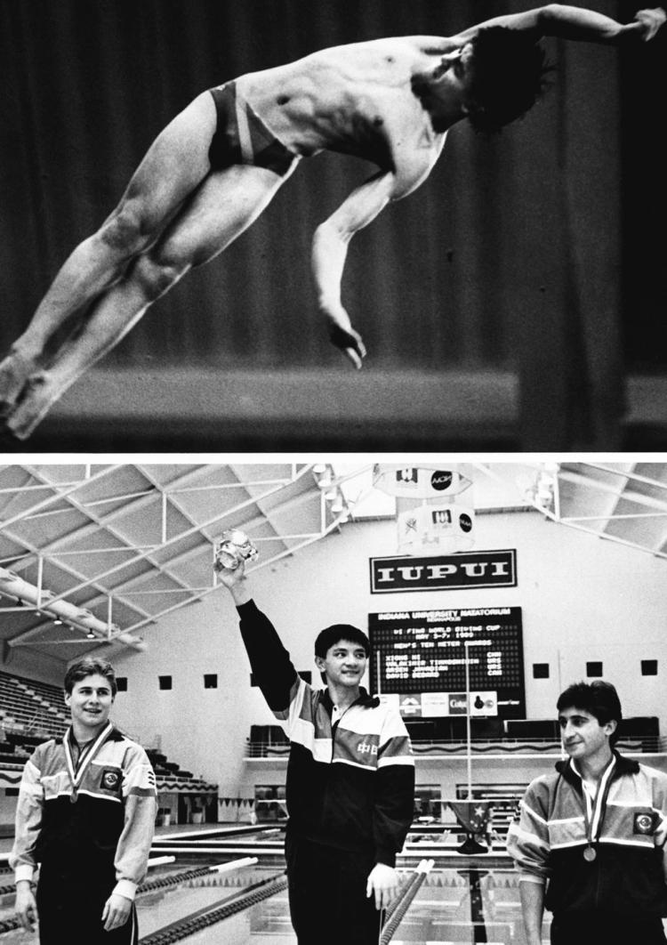1989年5月7日,中國選手熊倪奪得第六屆世界杯跳水賽男子十米跳臺跳水冠軍。上圖是他在比賽中,下圖是他在領獎臺上。新華社記者 韓居策 攝