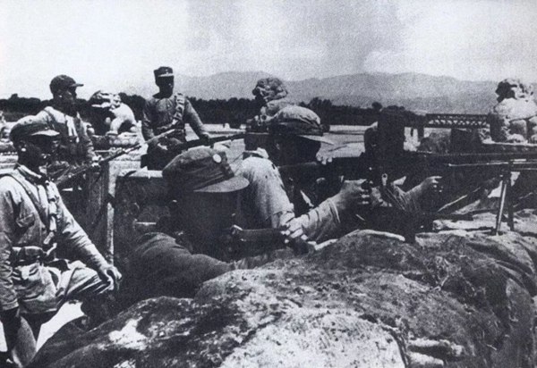 ↑1937年7月7日,駐華日軍發(fā)動(dòng)“七七事變”(又稱“盧溝橋事變”),開始全面侵華。這是中國軍隊(duì)在盧溝橋抗擊日軍的進(jìn)攻。新華社發(fā)