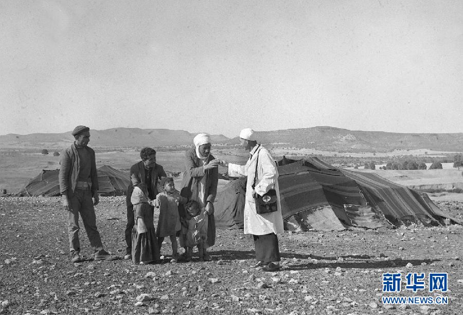 這張1965年的資料照片顯示,中國援阿醫生(右一)在阿爾及利亞賽伊達省為牧民診治。新華社發(王南生 攝)