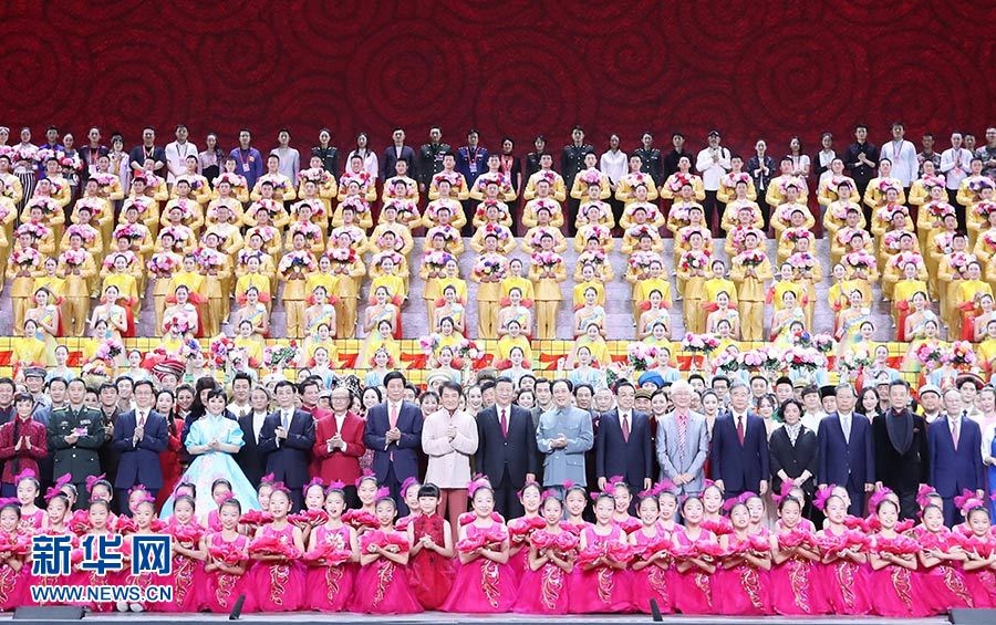 9月29日,慶祝中華人民共和國成立70周年大型文藝晚會《奮斗吧 中華兒女》在北京人民大會堂舉行。習(xí)近平、李克強、栗戰(zhàn)書、汪洋、王滬寧、趙樂際、韓正、王岐山等黨和國家領(lǐng)導(dǎo)人同4000多名觀眾一起觀看演出。演出結(jié)束后,習(xí)近平等走上舞臺同演職人員合影留念。 新華社記者 王曄 攝
