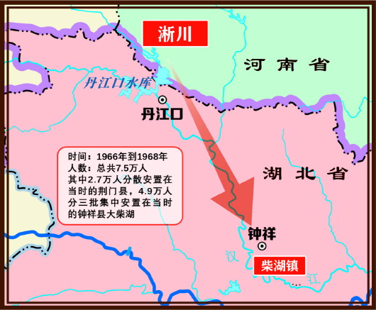 1967年丹江口大壩下閘蓄水。淅川縣是丹江口水庫重點淹沒區。從1966年到1968年,河南、湖北兩省共搬遷38萬人,淅川縣的移民占了20萬人。遷往湖北的淅川移民有7.5萬,其中,2.6萬人分散安置在當時的荊門縣,4.9萬人集中安置在當時的鐘祥縣大柴湖。