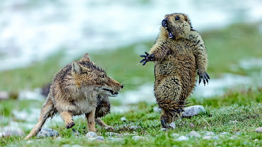 鮑永清的獲獎作品《生死對決》,展現的是一只藏狐捕獵旱獺的畫面:藏狐呲出的獠牙和旱獺手足無措的樣子,極富表現力,讓這個完美的瞬間充滿動感。人們仿佛聽見藏狐喉底顫出的低吟和旱獺的驚聲尖叫。無數被打動的人心,自會臆想出種種結局。