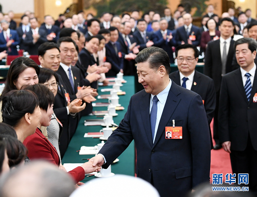 3月8日,中共中央總書記、國家主席、中央軍委主席習近平參加十三屆全國人大二次會議河南代表團的審議。在“三八”國際勞動婦女節(jié)到來之際,習近平代表黨中央,向參加全國兩會的女代表、女委員、女工作人員,向全國各族各界婦女,致以節(jié)日的祝賀和美好的祝福。這是習近平同女代表親切握手。新華社記者 謝環(huán)馳 攝