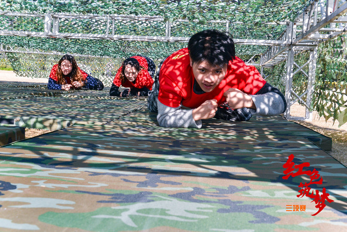 上午九時,一支隊伍正合力將長繩和70面國旗串聯懸掛至旗海中,讓人聯想起第一面五星紅旗在開國大典廣場上飄揚的場景;另一支隊伍的幾位隊員正用PVC管作為連接,合力吹氣將5個氫氣球吹爆,這是在通過游戲的形式致敬1967年的第一顆氫彈爆炸成功;還有一群隊員穿著救生衣、膠鞋扛著自己的隊友穿越洪水區、獨木橋區、沼澤地區,還原98 年抗洪搶險、5.12抗震救災的場景……