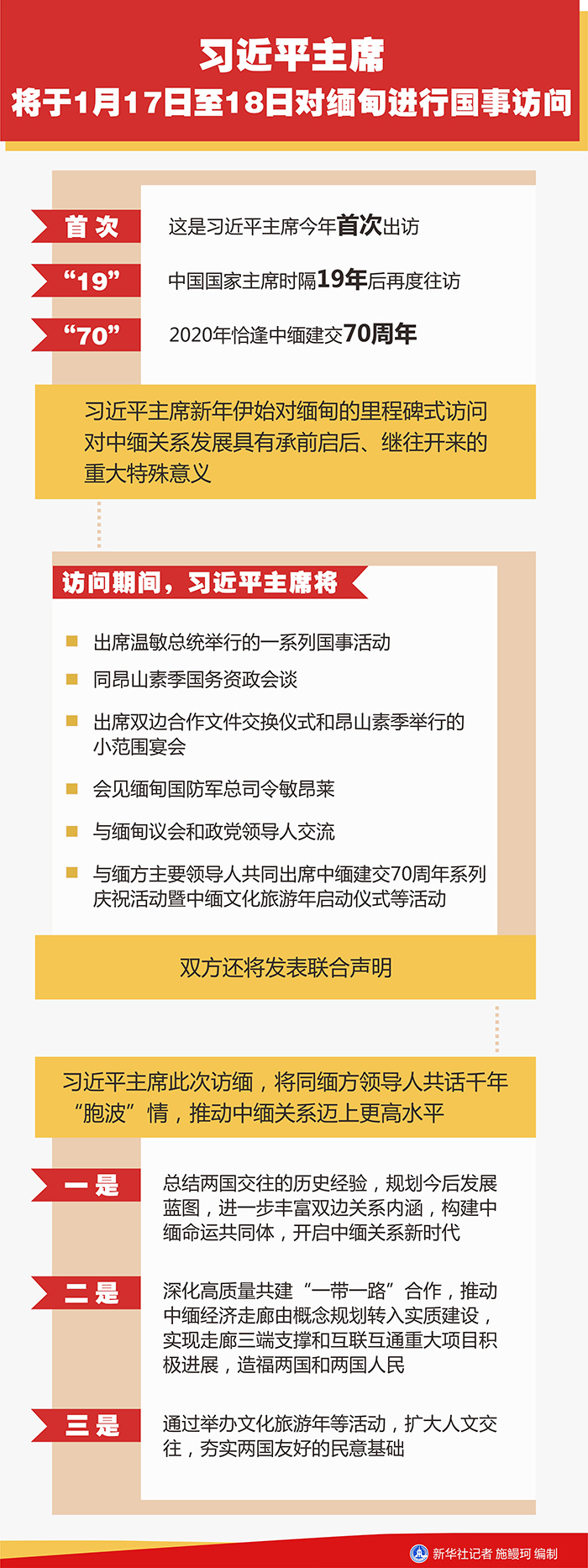 羅照輝表示,訪問期間,習近平主席將出席溫敏總統舉行的一系列國事活動,同昂山素季國務資政會談,出席雙邊合作文件交換儀式和昂山素季舉行的小范圍宴會,會見緬甸國防軍總司令敏昂萊,與緬甸議會和政黨領導人交流,并與緬方主要領導人共同出席中緬建交70周年系列慶祝活動暨中緬文化旅游年啟動儀式等活動。雙方還將發表聯合聲明。