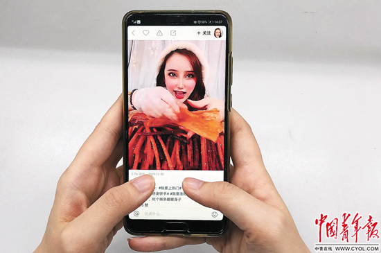 一位消費者在查看手機里關于網(wǎng)紅食品的視頻。中青報·中青網(wǎng)記者 李崢苨/攝