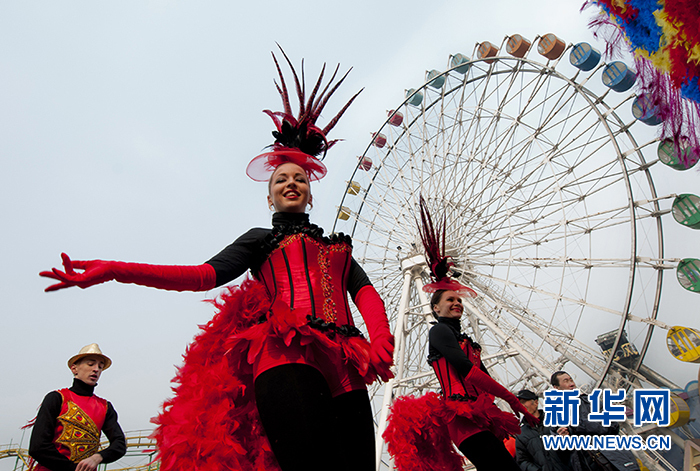2015年2月19日,在北京石景山游樂(lè)園“迎春洋廟會(huì)”上,幾名外國(guó)演員參加盛裝巡游。(圖片來(lái)源:新華社 李文明 攝)