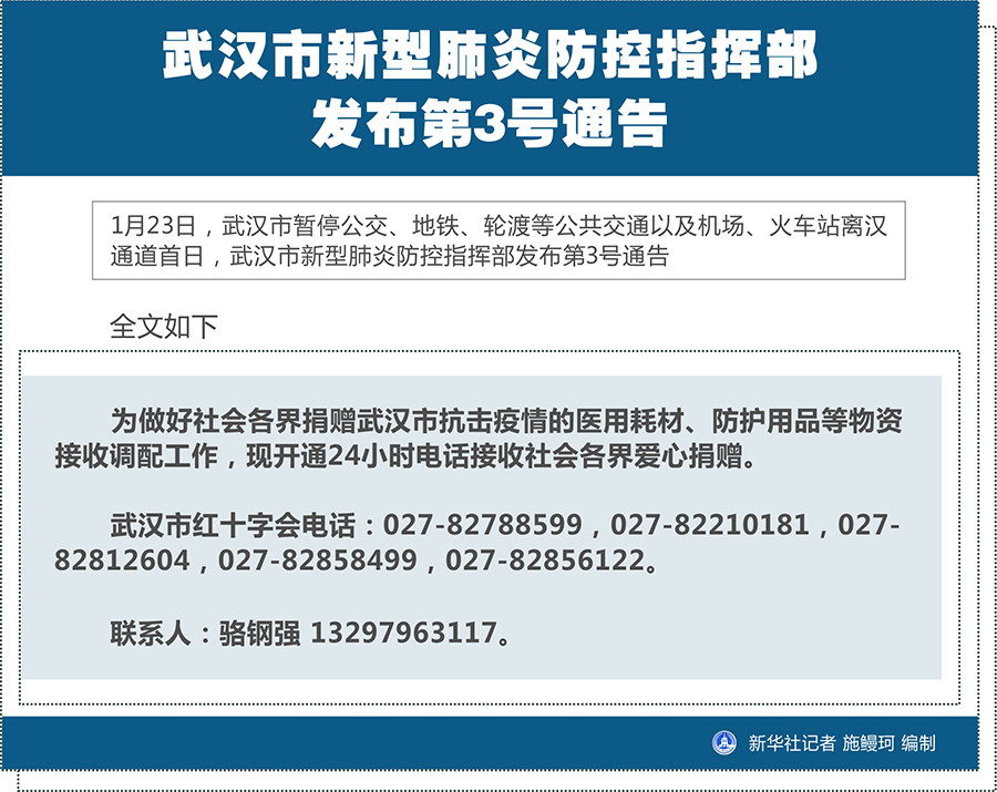 新華社武漢1月23日電(記者廖君 馮國棟)23日,武漢市暫停公交、地鐵、輪渡等公共交通以及機場、火車站離漢通道首日,武漢市新型肺炎防控指揮部發布第3號通告,全文如下: