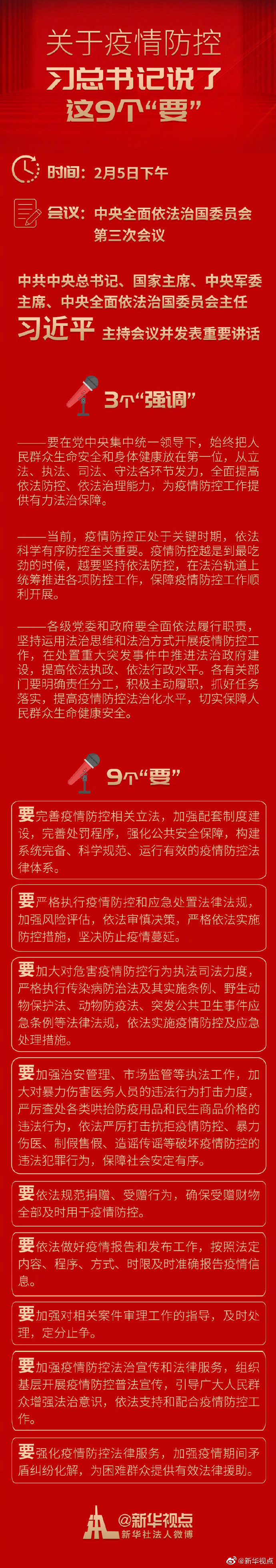 2月5日下午,中共中央總書記、國家主席、中央軍委主席、中央全面依法治國委員會(huì)主任習(xí)近平主持召開中央全面依法治國委員會(huì)第三次會(huì)議強(qiáng)調(diào),全面提高依法防控依法治理能力,為疫情防控提供有力法治保障。