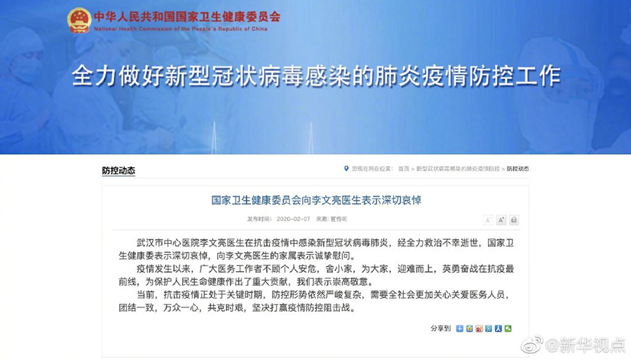國家衛(wèi)生健康委員會向李文亮醫(yī)生表示深切哀悼-新華網(wǎng)