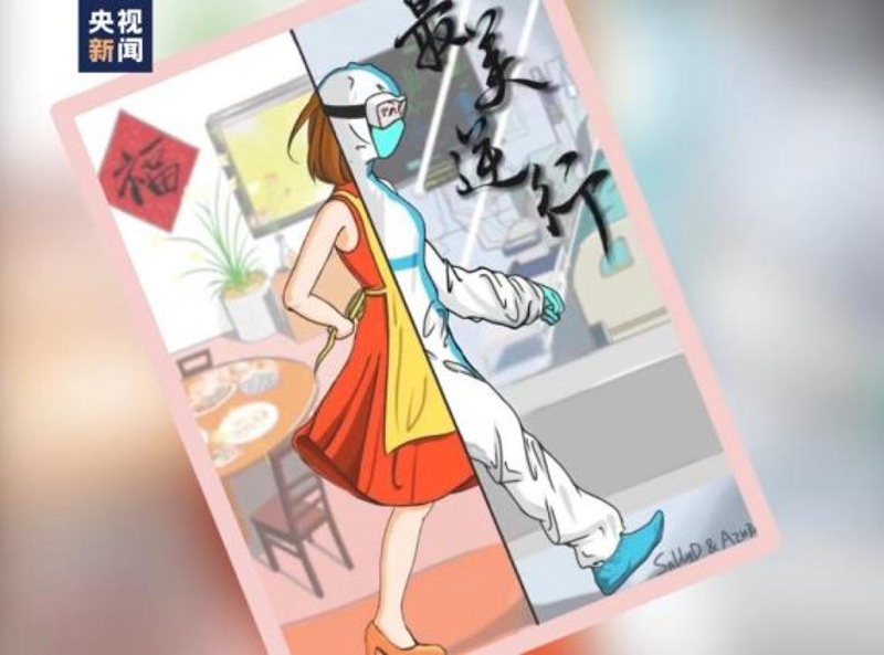 設計師董思喬的母親,是北京大學人民醫院的一名醫務工作者。在董思喬七歲那年,正逢非典暴發,她的母親堅守崗位留在醫院救治患者。十七年后,新冠肺炎來襲,她看到很多醫務工作者也像當年她的母親一樣在最危險的地方戰斗,義無反顧,馳援武漢。于是,她拿出畫筆畫出她心中醫務工作者們最美的樣子:“身后,是飄香的飯菜,是溫馨的家;面前,是防疫一線,是需要救治的患者。逆行者們,愿你們平安歸來?!?/p>