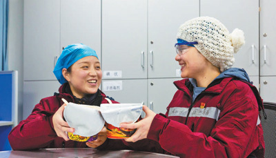 2月9日,中南大學(xué)湘雅二醫(yī)院援鄂醫(yī)療隊護士周杰楠(右)在武漢度過了29歲生日。在緊張的工作間隙,她與同樣是當(dāng)天過生日的同事曾艷一起吃方便面當(dāng)做慶祝。本報記者 張武軍攝