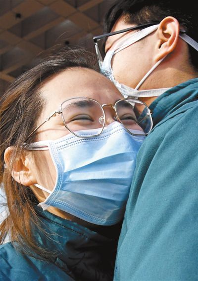 河南省直第三人民醫(yī)院的劉光耀(右)和喬冰是一對“90后”情侶,一起報名參加援鄂醫(yī)療隊。2月2日,醫(yī)療隊出發(fā)前,兩人擁抱著相互鼓勁。新華社記者 李 安攝