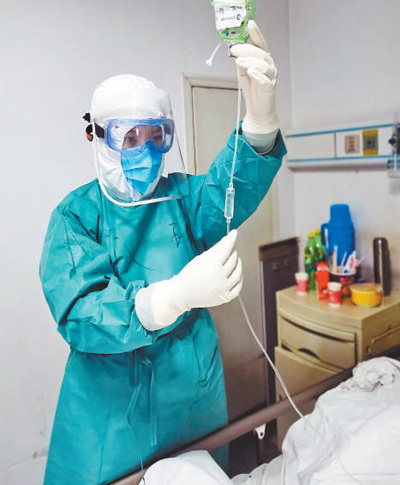中山大學(xué)孫逸仙紀(jì)念醫(yī)院呼吸內(nèi)科二區(qū)“90后”護師袁漢珍,與同事一起馳援武漢市漢口醫(yī)院,堅守病患救治一線。圖為袁漢珍正在為病人輸液。鮮 敢 張 陽攝影報道