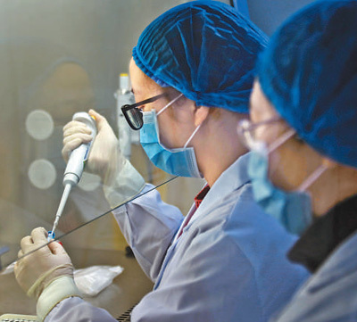 重慶市長壽區(qū)疾病預(yù)防控制中心“90后”女檢測員文纖纖(左)、楊涵與病毒“零距離”對峙,持續(xù)戰(zhàn)斗在新型冠狀病毒PCR檢測室,為患者的診治爭取了寶貴時間。圖為兩位檢測員在提取化驗結(jié)果。樊 強攝(人民視覺)